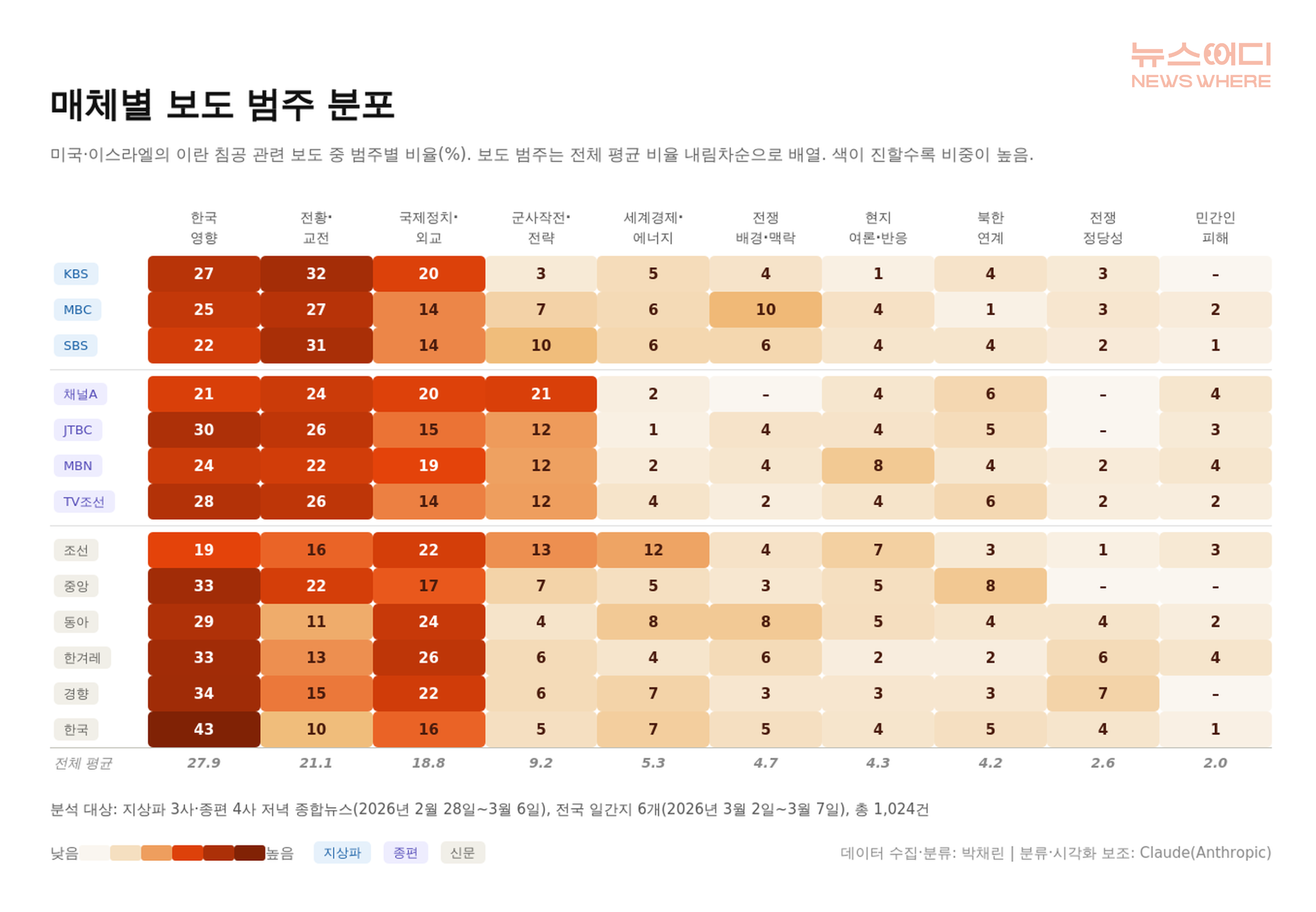 ์ ์ฒด ๋ณด๋์ ์ฝ 28%๊ฐ โํ๊ตญ ์ํฅโ(๊ต๋ฏผ ์์ , ์ ๋ถ ๋์, ํ๊ตญ ๊ฒฝ์ ํผํด)์ ์ง์ค๋๊ณ , โ๋ฏผ๊ฐ์ธ ํผํดโ ๊ด๋ จ ๋ณด๋๋ ํ๊ท 2%์ ๋ถ๊ณผํ์ต๋๋ค.